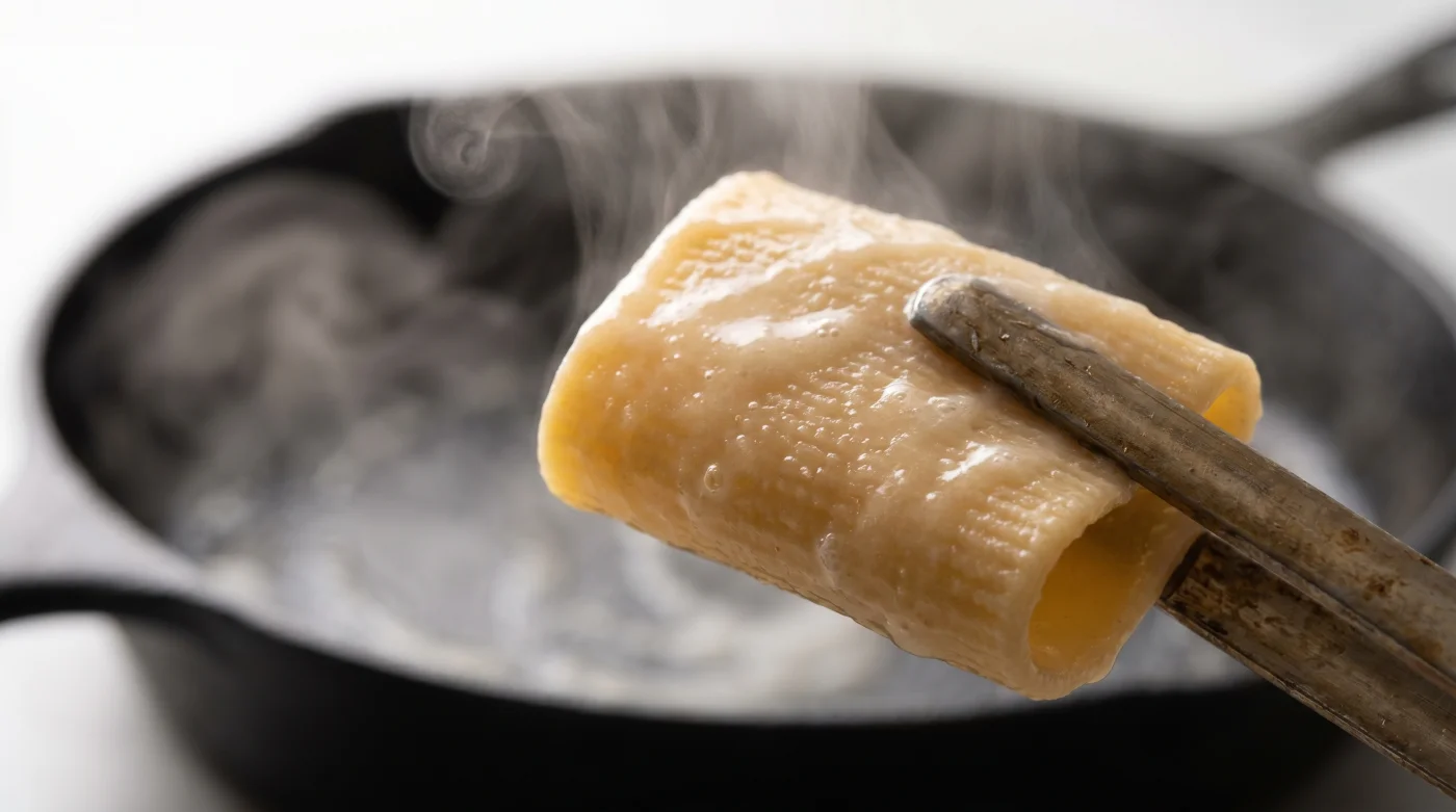 Per strutture complesse come un corposo ragù di carne o creme dense di verdure, le salse possiedono già i propri leganti naturali. In questo specifico caso, la mossa vincente è spegnere il fuoco a tre quarti del tempo e lasciare la pasta immersa, a coperchio chiuso, per un ultimo minuto: il cuore del formato si rilassa dolcemente senza sfaldare la preziosa ruvidezza esterna per afferrare i pezzi di carne.